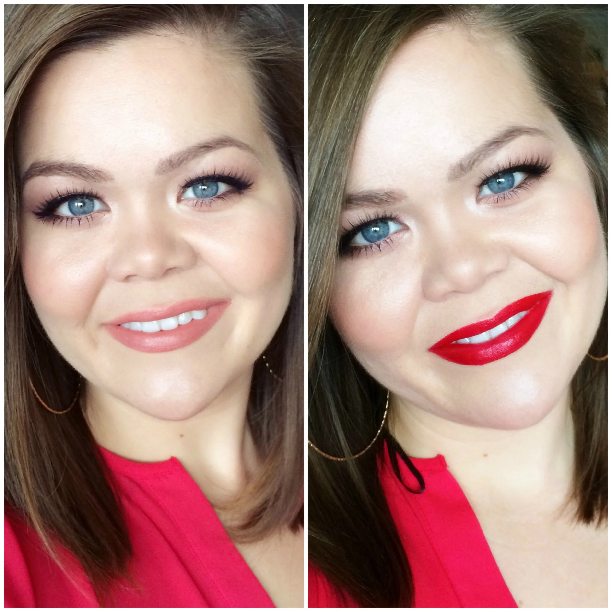 On the left, I'm wearing MAC Myth & Cream Cup lipsticks, blended into Spice liner. On the right I'm wearing J Lo's Pure Red, by L'Oreal, and that's it. Side note: that red lippy is PIGMENTED! This look was achieved with one swipe of the tube. ONE!! *insert contented, amorous sigh here*